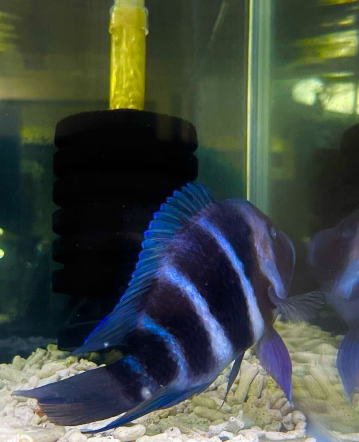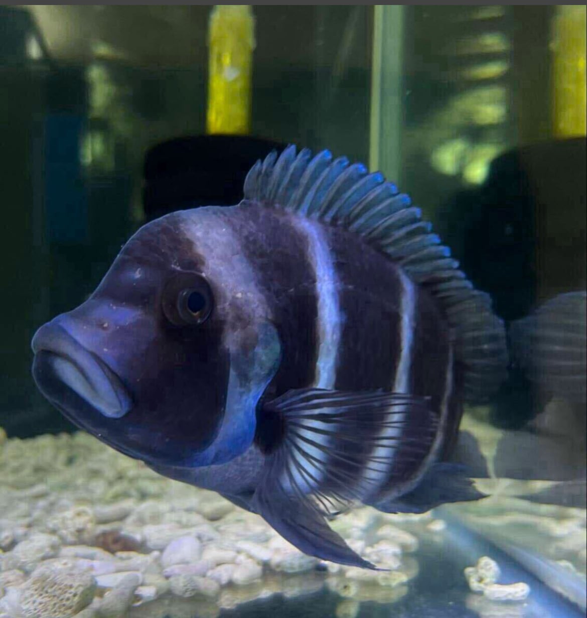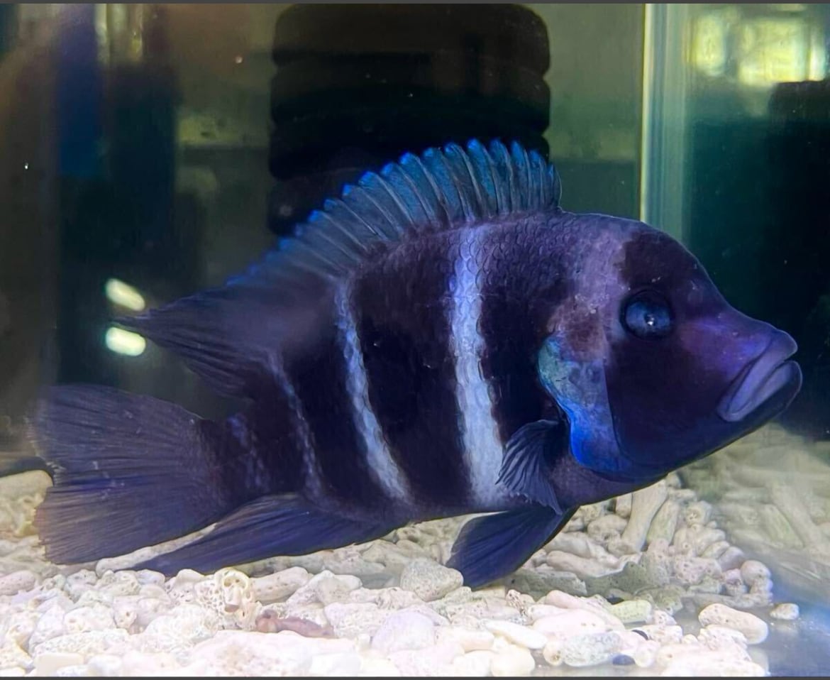 アフリカのタンガニーカ湖西側、ザイール共和国付近に生息するブルーの発色が非常に濃く鮮やかなフロントーサの地域変異種です。特に「モバ」はフロントーサの中でも最も青みが強く、多くの熱帯魚愛好家から高い人気を誇ります。 成長すると約20cmほどになります。現在のサイズは約17cmです。 丈夫で人工飼料にもよく慣れ、飼育しやすい種類ですが、水質は弱アルカリ性から中性が適しています。大きく成長するため、十分な水槽環境をご用意ください。