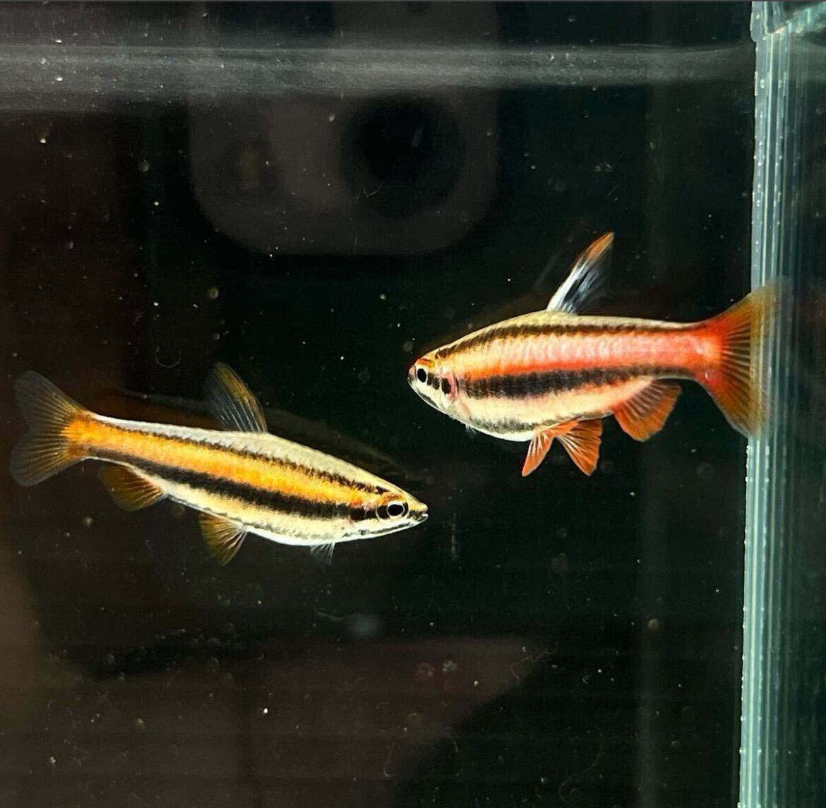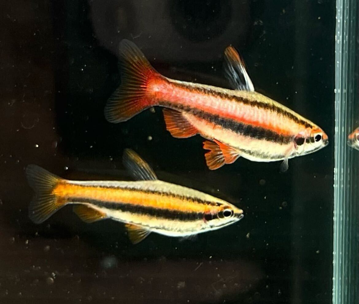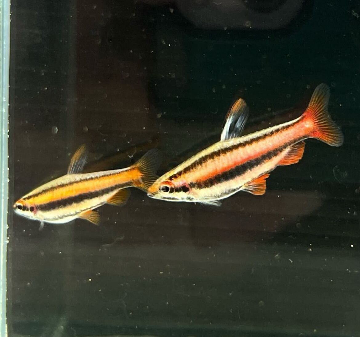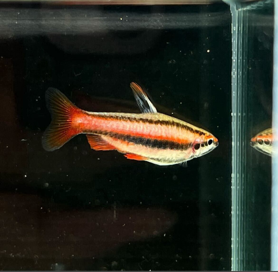 背鰭の色彩や発色の違う個体2匹の出品です。アークレッドペンシルフィッシュは、南米の河川に生息する小型の熱帯魚で、深く濃い赤色の体色が魅力的です。体長は約3〜4cmほどで、特にオスは赤みが強く、ヒレや体に入る黒いラインがアクセントとなり、美しく映えます。