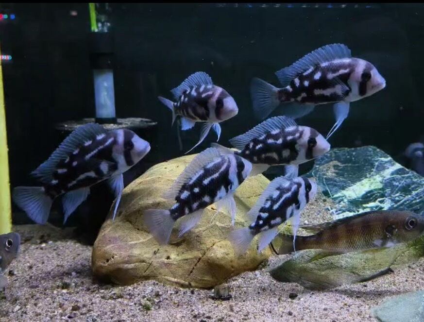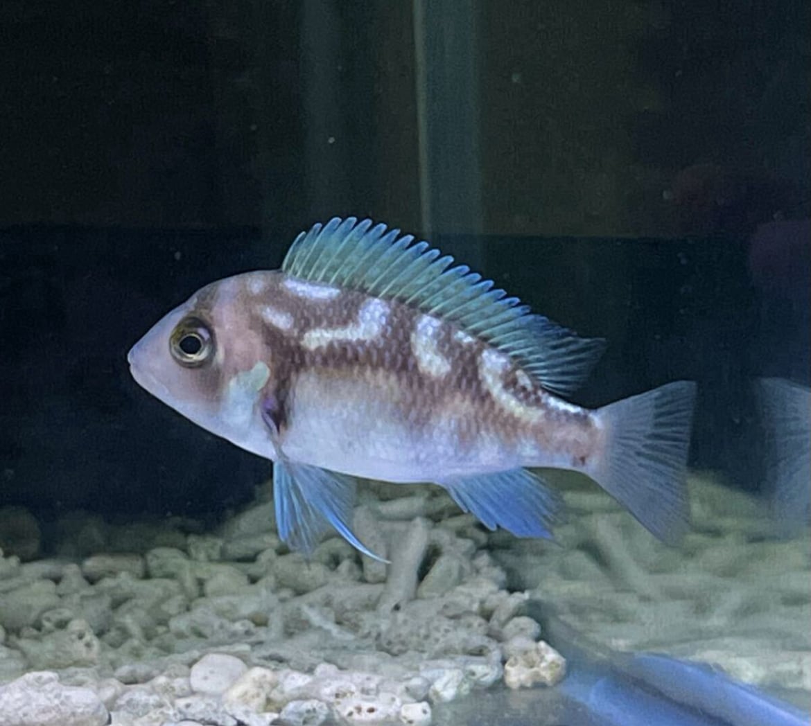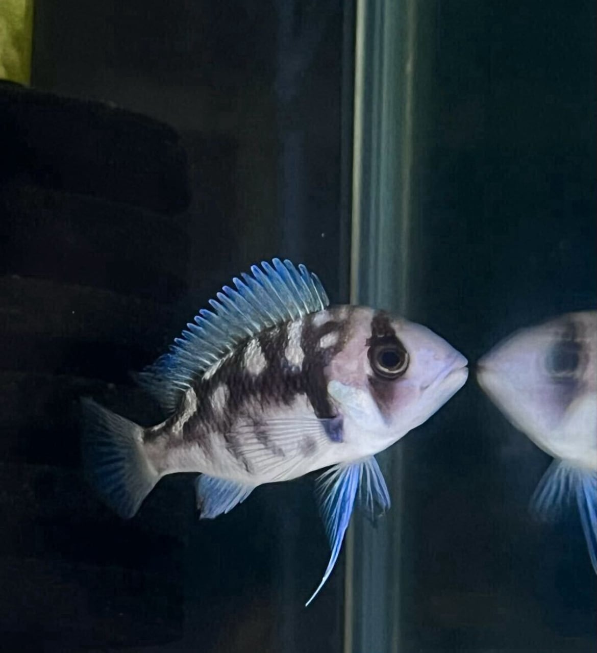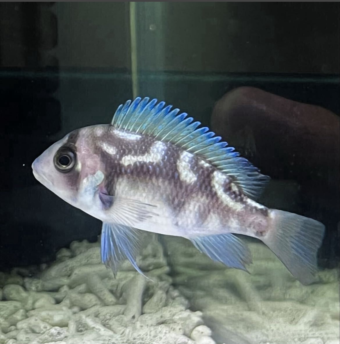 アフリカ・タンガニィカ湖に生息する人気シクリッド「フロントーサ」。 ナイトスターは、通常のフロントーサが持つ白と黒の縦バンド模様が、非常に美しい変異個体です。その独特な模様は唯一無二で、水槽の中で幻想的な存在感を放ちます。 このナイトスターは、模様の表れ方が個体ごとに異なります。同じ模様を持つ個体は存在せず、まさに「世界に一匹だけのデザイン」。その希少性と芸術的な美しさから、国内外の愛好家・コレクターに非常に人気があります。 照明を浴びるたびに浮かび上がる星のような青く光る鱗は、見るたびに新しい表情を見せてくれます。力強くも優雅な泳ぎ、堂々としたその姿は、まさにアクアリウムの主役にふさわしい一匹です。 写真の通り、体側に美しいナイトスターの独特な模様がしっかりと入っており、輝くような仕上がりです。ここまで整った模様の個体は滅多に入荷しません。 あなただけの特別なフロントーサライフをお楽しみください。