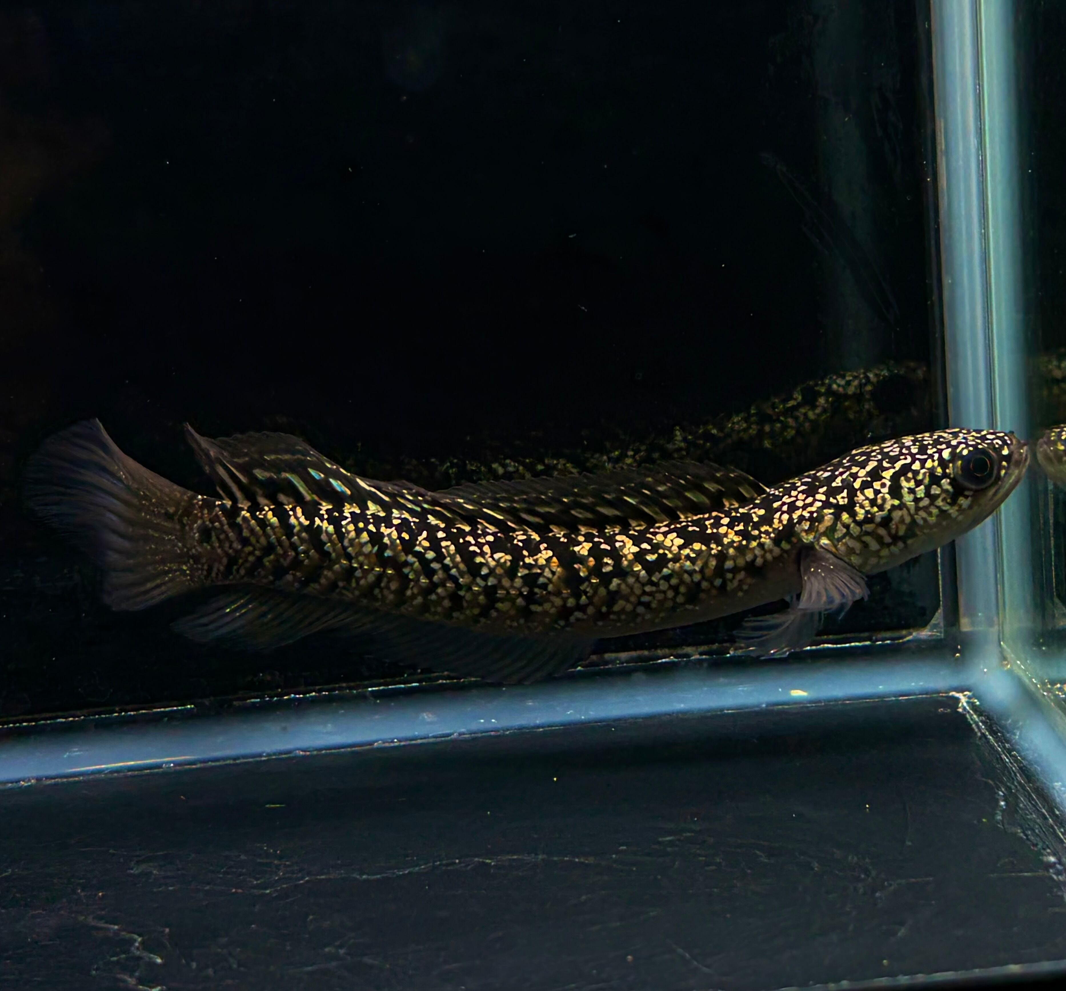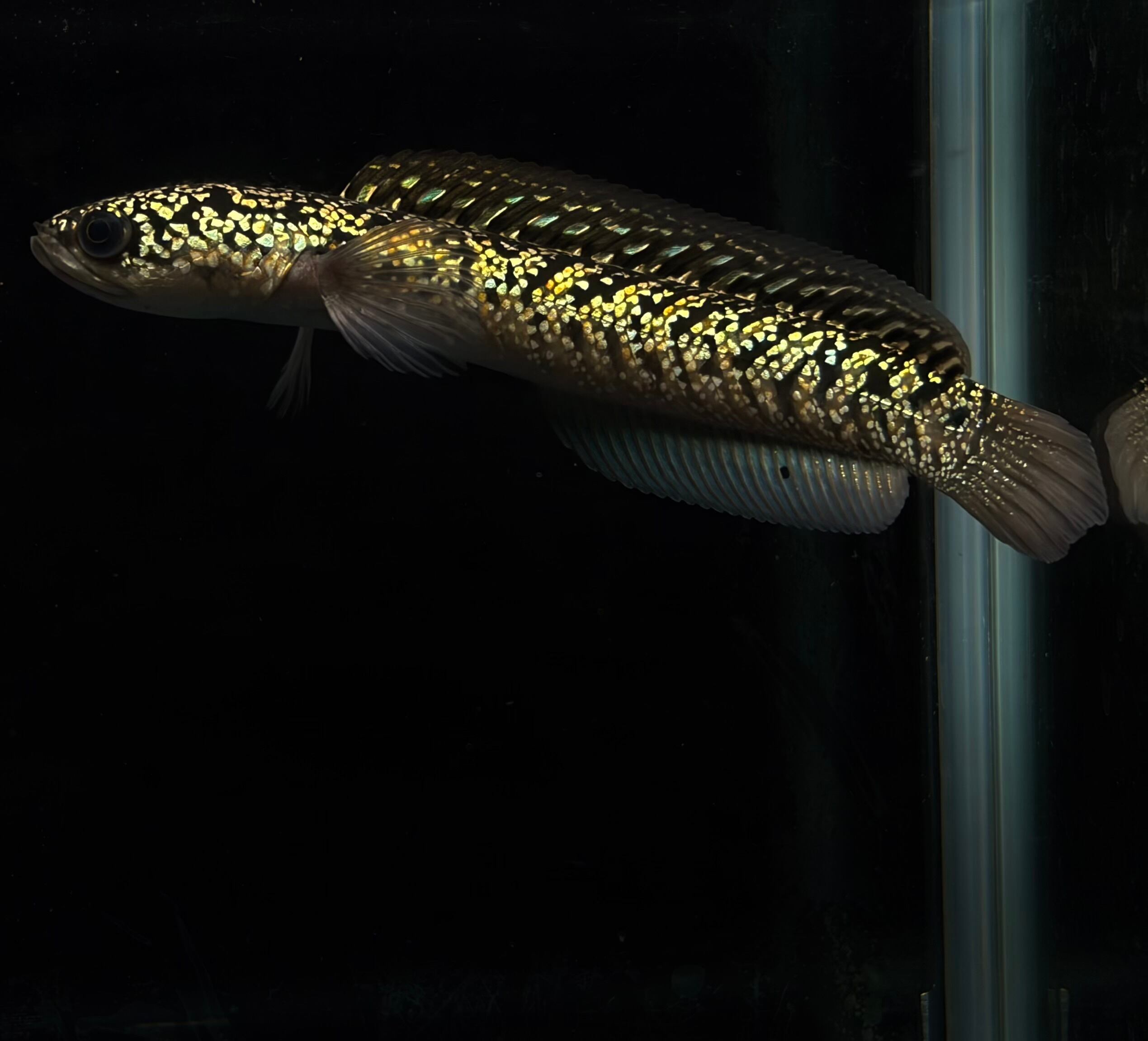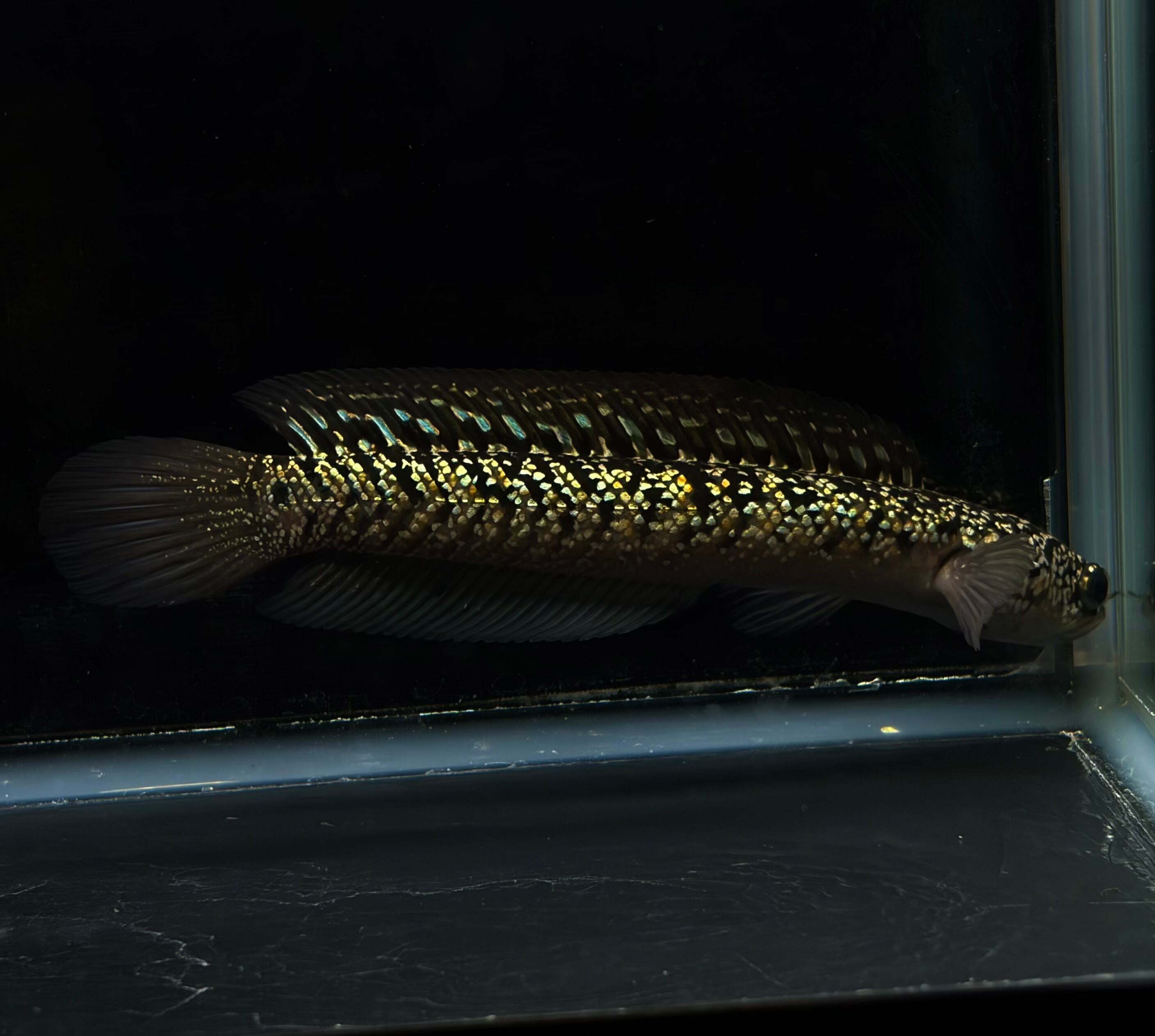 台湾で生まれた新しい雷龍品種、金天目(金雷龍)。まるで金色の曜変天目茶碗のように美しい全身に輝く金色の鱗が特徴です。その美しさは、光を浴びると黄金色を放ち、見る者を魅了します。