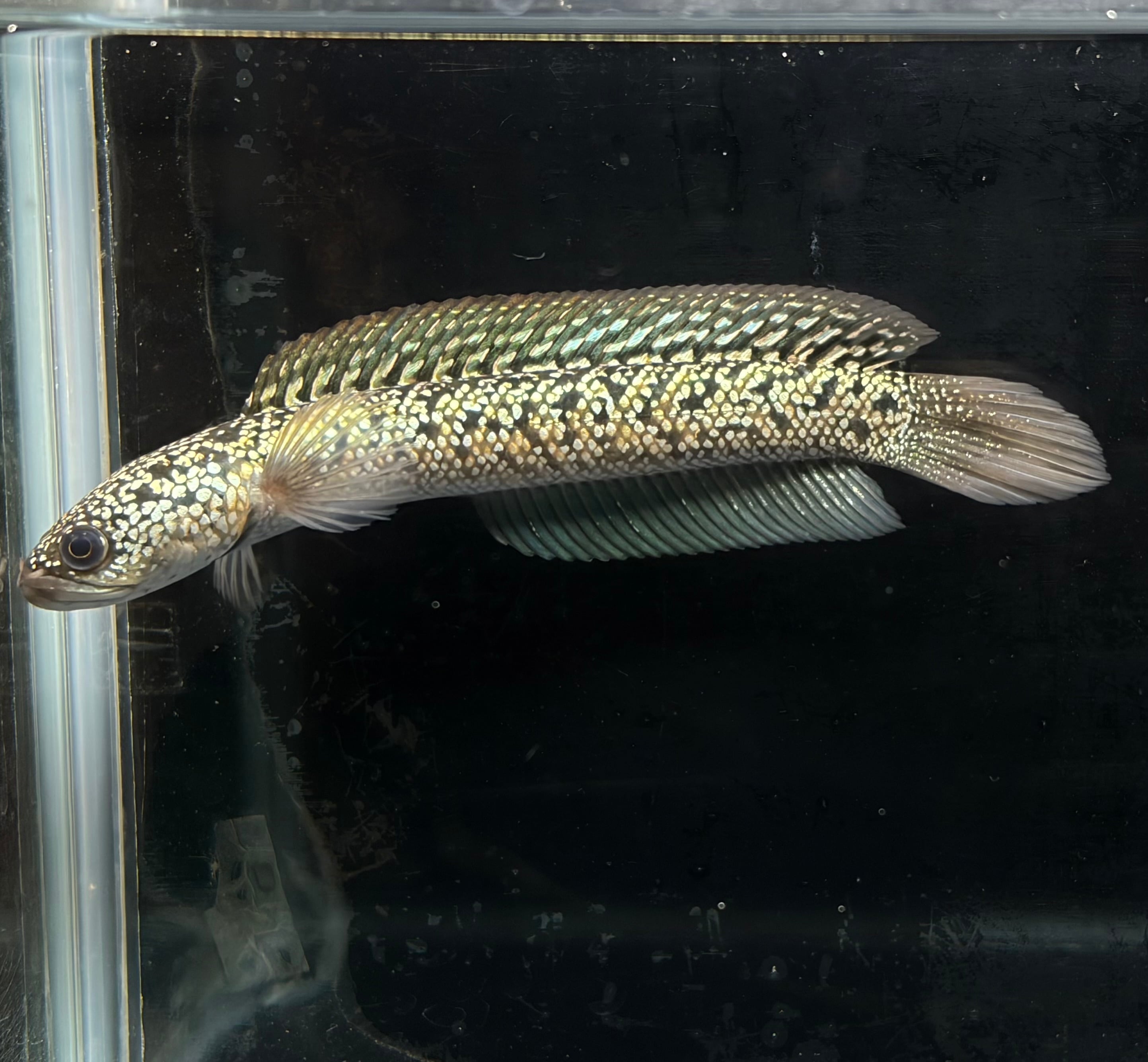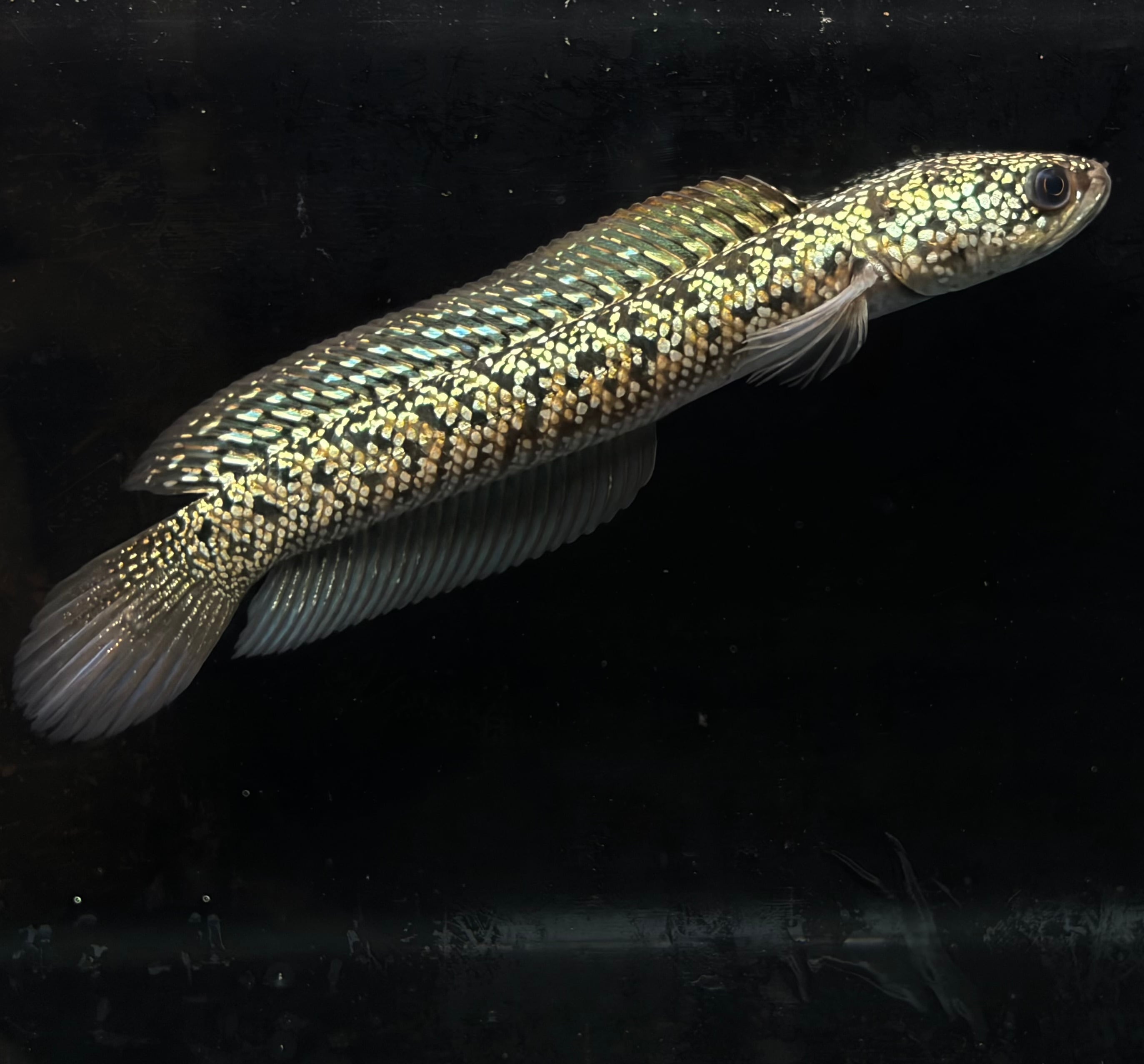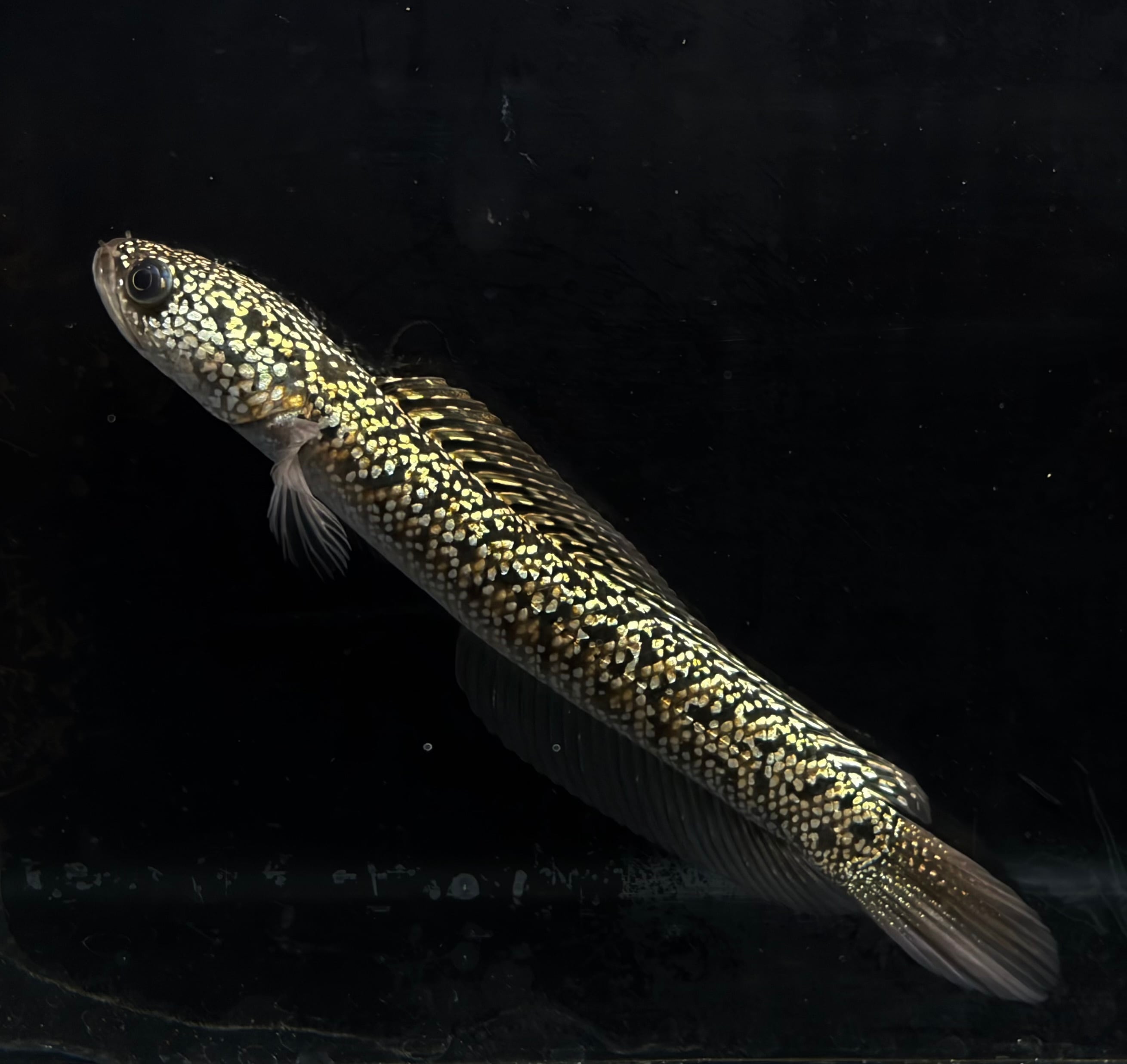 台湾で生まれた新しい雷龍品種、金天目(金雷龍)。まるで金色の曜変天目茶碗のように美しい全身に輝く金色の鱗が特徴です。その美しさは、光を浴びると黄金色を放ち、見る者を魅了します。
