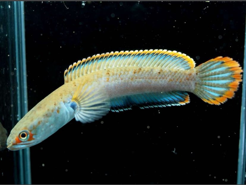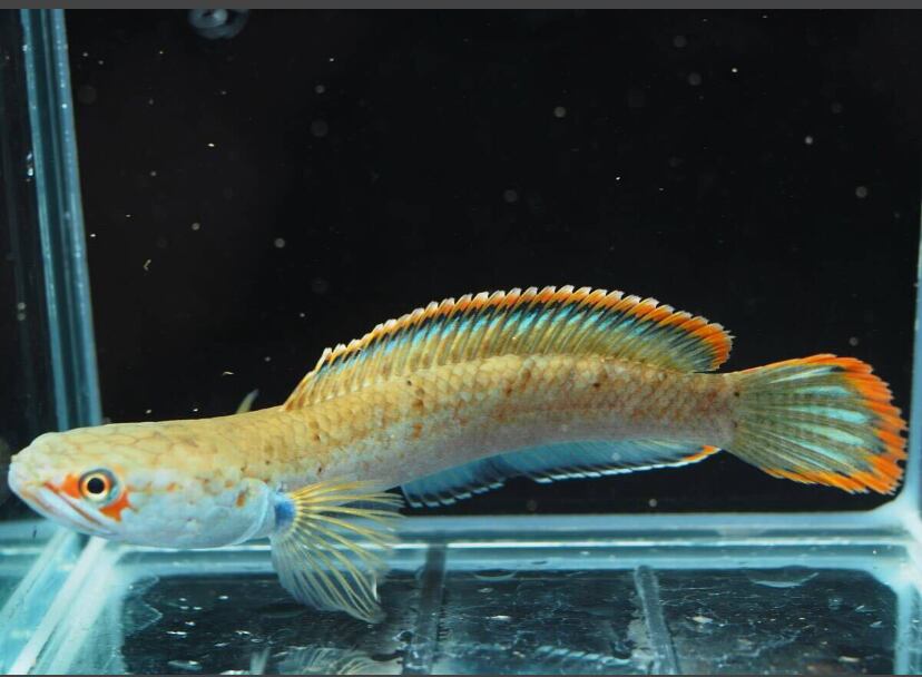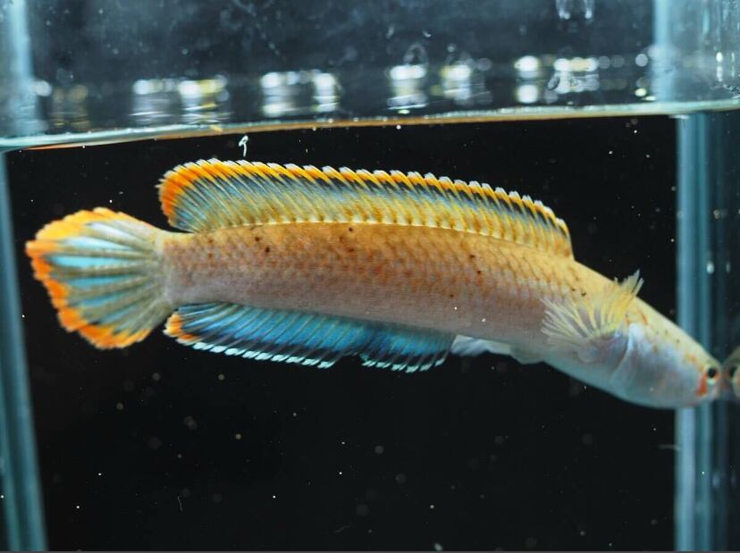アイズファイヤースネークヘッドは、タイとミャンマーの国境に生息する魅力的な中型のスネークヘッドで、最大で約25cmに成長するため飼いやすいサイズが特徴です。目の周囲にある赤い模様は「歌舞伎」を思わせ、光沢のある青色の体は水槽に華やかな雰囲気をもたらします。性格は比較的穏やかで、単独飼育が推奨されますが、人工飼料にも容易に適応できるため、初心者にも扱いやすい魚です。水温は20~28℃、中性に近い水質での飼育が可能で、60cmの水槽で終生飼うことができます。飼い主に対して親しみやすく、エサを求めるかわいらしい仕草は癒しの存在となります。
