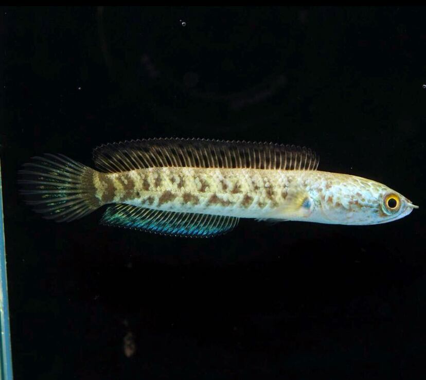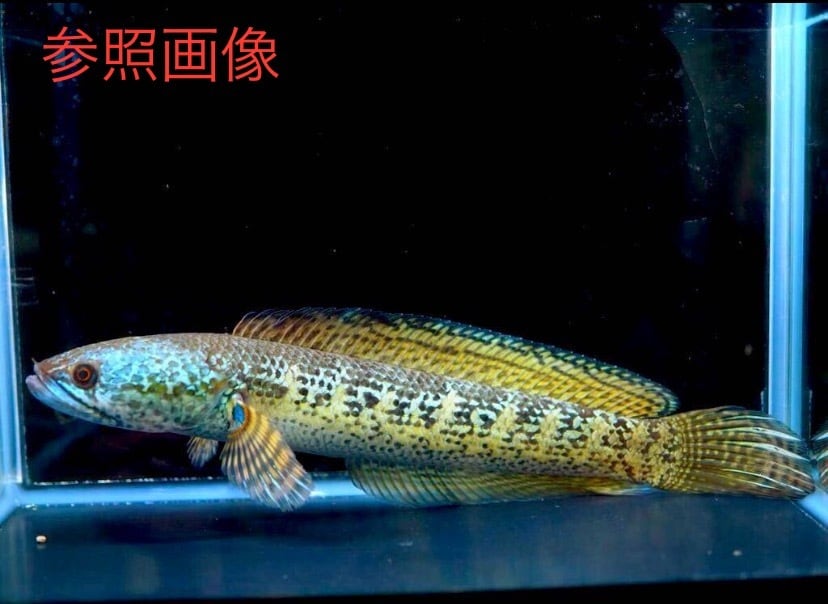 このスネークヘッドは茶色がかった色で、側面は黄色のストライプが首から尾の付け根まで続いており、腹や鰭は青みがかった色が出ます。その美しい姿から非常に人気がある種となっております。